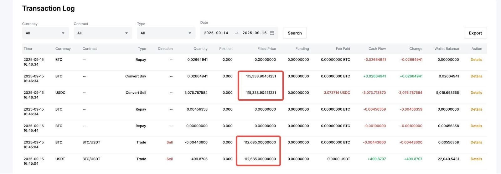 ملحوظة: عند إجراء أي تحويل من تشفير إلى تشفير للسداد — على سبيل المثال، تبديل USDC إلى BTC — سترى سجلين للمعاملات. سيظهر هذان السجلان نفس السعر المُنفذ. يتم حساب السعر المُنفذ المعروض لمعاملات الصرف بناءً على الصيغة: (المبلغ الذي تم صرفه – الرسوم) / المبلغ الذي تم صرفه
