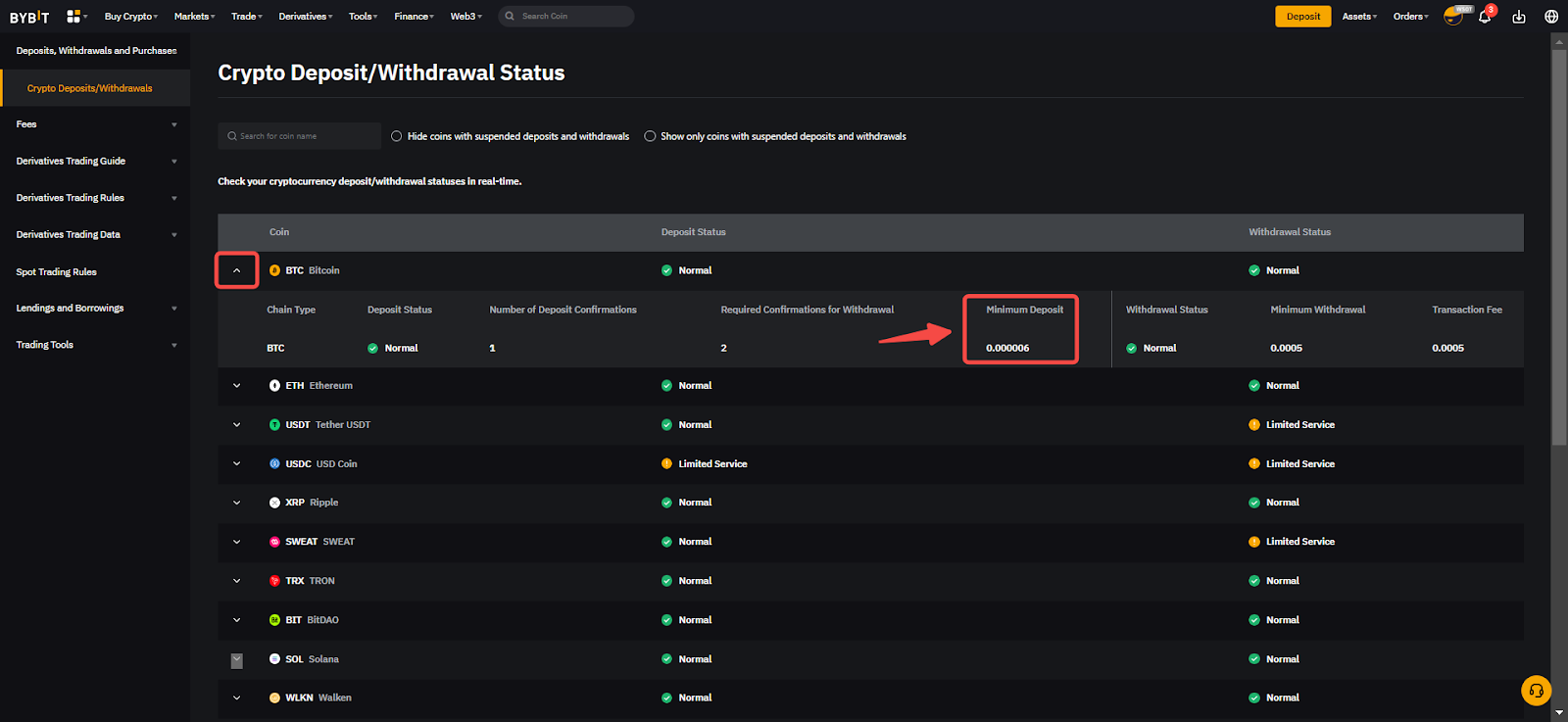 يمكنك العثور على قائمة بالحد الأدنى لمبالغ الإيداع لكل عملة في صفحة حالة إيداع/سحب العملات الرقمية. يُرجى النقر على زر القائمة المنسدلة للعملة التي ترغب في إيداعها أو سحبها لعرض حالة الإيداع لكل نوع من أنواع السلاسل المدعومة، بالإضافة إلى المعلومات اللازمة لإجراء إيداع ناجح.
