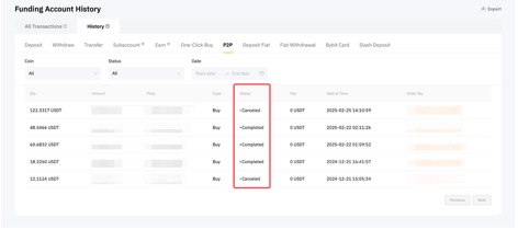 تسمح لك علامة التبويب التاريخ بعرض جميع تاريخ معاملات الأصول الخاصة بك بناءً أساسًا على الأنواع والطرق التي تتلقى أو ترسل بها الأصول المدارة الخاصة بك. تشمل هذه الفئات إيداعات وسحوبات العملات المشفرة/النقود الورقية، التحويلات، الشراء بنقرة واحدة، التداول من نظير لنظير، الحساب الفرعي، العائد، ومعاملات بطاقة Bybit.