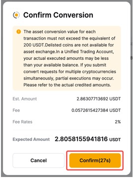 لتحسين استخدام الأصول الصغيرة في حسابك على Bybit، يمكنك تحويل أي أصول تقل قيمتها عن 0.001 BTC أو ما يعادلها إلى MNT، USDT، أو USDC في عملية تحويل واحدة باتباع أربع خطوات بسيطة. يدعم تحويل الأرصدة الصغيرة باستخدام كلاً من حساب التمويل وحساب التداول الموحد (UTA). يرجى ملاحظة أن تحويل الرصيد الصغير يقتصر على مرة واحدة كل ساعة واحدة.