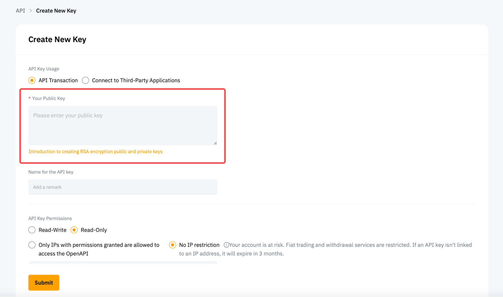 Step 4: Copy the Public key you generated from the RSA Key Generator and paste it into Your Public Key box. Click on Submit.