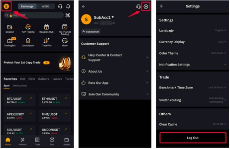 عند تسجيل الدخول عبر صفحة الدخول الخاصة بـ Bybit، يمكنك تسجيل الخروج من حسابك الفرعي بالنقر على صورة الملف الشخصي في الصفحة الرئيسية، وفتح صفحة الإعدادات والتمرير إلى نهاية القائمة للنقر على زر تسجيل الخروج.