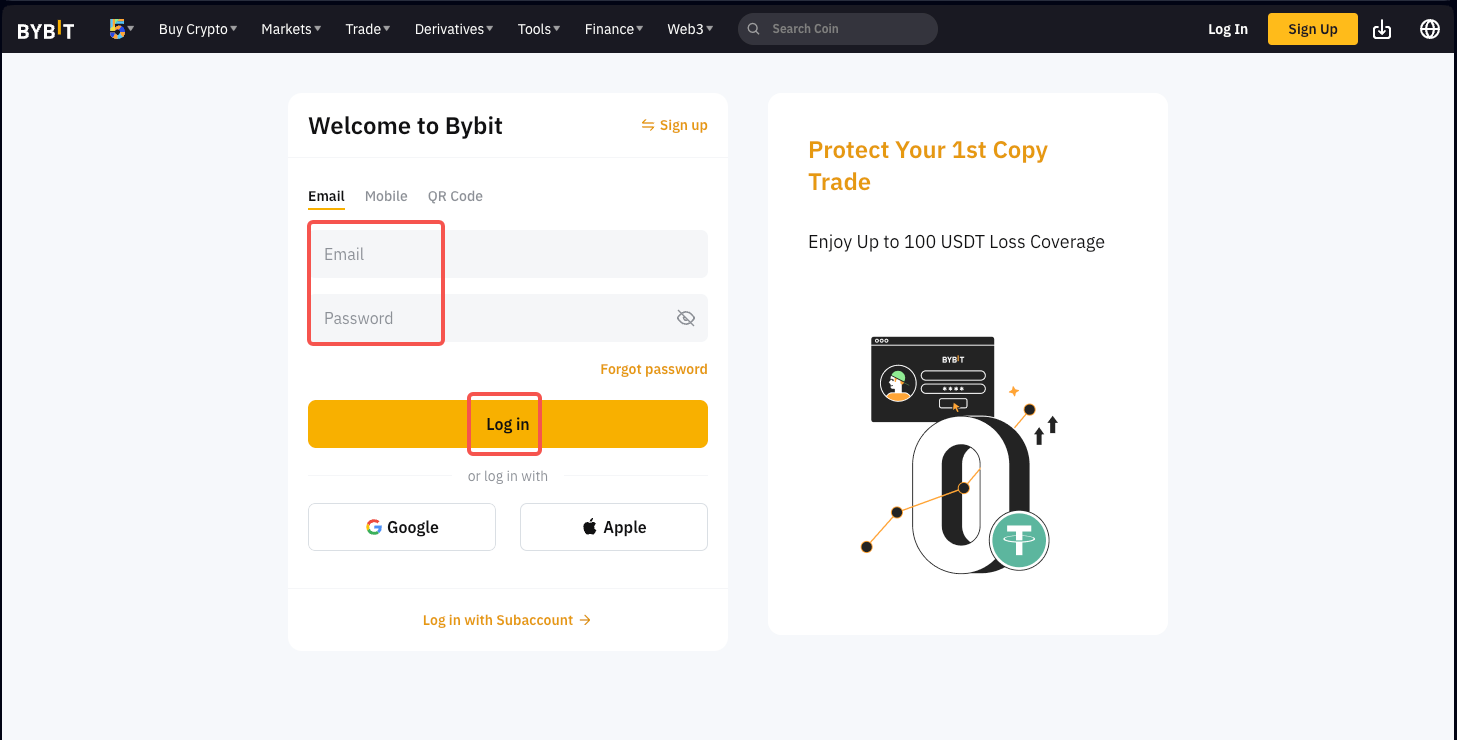 الخطوة 1: انتقل إلى صفحة تسجيل الدخول إلى Bybit وأدخل بيانات اعتماد الحساب المعطل. ثم انقر على تسجيل الدخول.