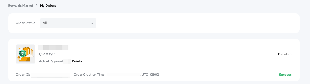 يمكنك العثور على سجلات حالة الاسترداد الخاصة بك فيصفحة الطلبات الخاصة بي. عند النقر على التفاصيل، يمكنك الوصول إلى جميع المعلومات المتعلقة بالاسترداد، بما في ذلك رقم التعريف الخاص بالطلب، وقت الإنشاء، ميعاد الانتهاء، نوع العملة، عملة، مبلغ المكافأة، ومبلغ دفع النقاط.