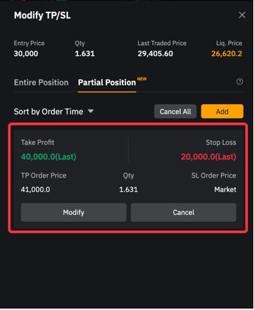 يمكن للمتداولين تعيين أوامر TP/SL متعددة وتحديد كمية الطلب من خلال وضعية جزئية. ستتم تنفيذ كمية الطلب لأوامر TP/SL الجزئية حسب كمية الطلب المحددة أو الحد الأقصى لكمية العقد لمركزك المفتوح، أيهما أقل، وسيتم إلغاء أمر SL (أو TP) المقابل. لن يتم إنشاء وضعية في الاتجاه المعاكس.