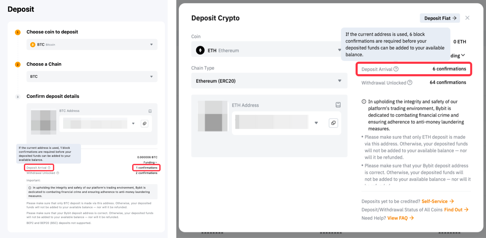 Bybit has specific requirements for the number of blockchain confirmations needed for various coins before the transfer amount can be credited to your Bybit Wallet.