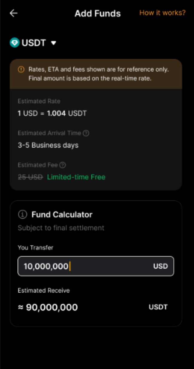 Bank Transfer + acts as a bridge between your fiat and crypto assets. When you add funds via Bank Transfer +, your fiat is automatically converted into USDT or USDC and credited to your Funding Account. Likewise, when you withdraw USDT or USDC, it is automatically converted into fiat and transferred to your bank account. Bank Transfer + does not hold your funds.