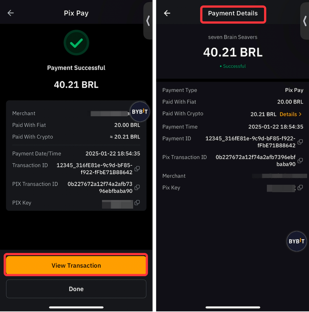 All the transaction history, including PIX Pay with a Bybit Card and Bybit Pay, will be recorded in the Bybit Pay transaction history.