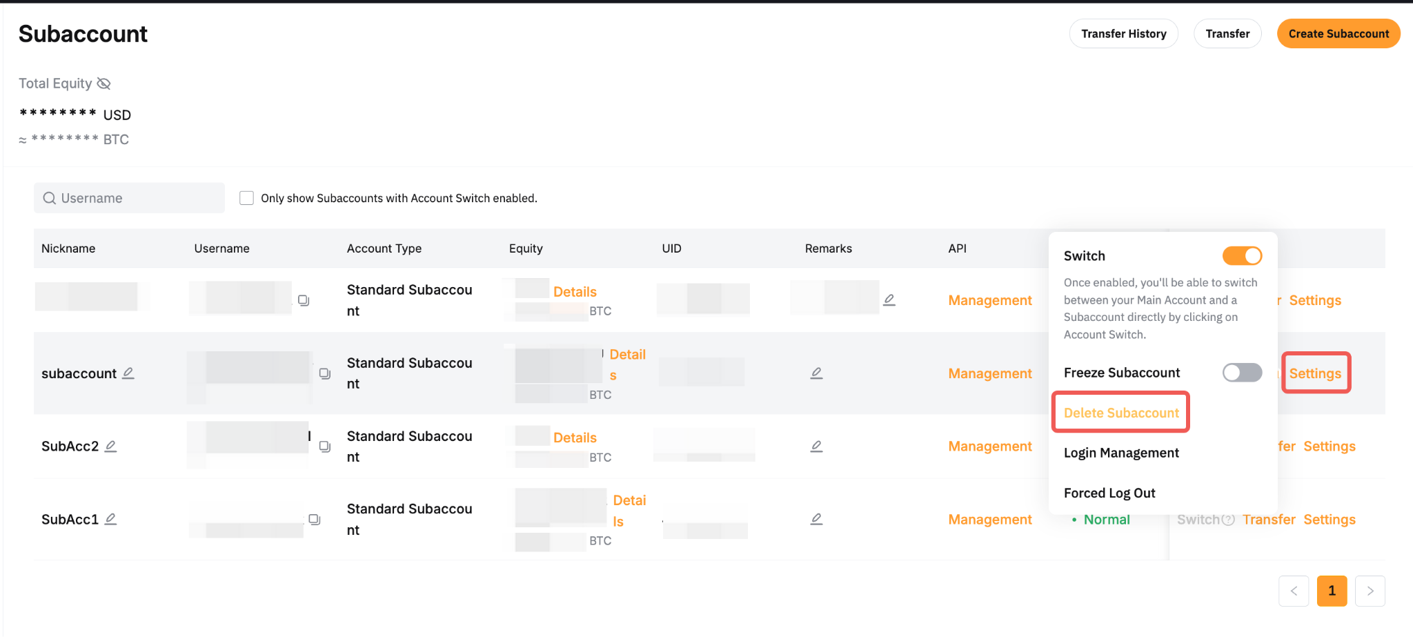 Main Account can perform 2 way transfers between the Main Account and all standard subaccounts created as well as transfers between two subaccounts. Standard subaccounts can only perform one way transfer to the Main Account. For more details on how to transfer the assets, please refer to: How to Get Started With a Standard Subaccount.