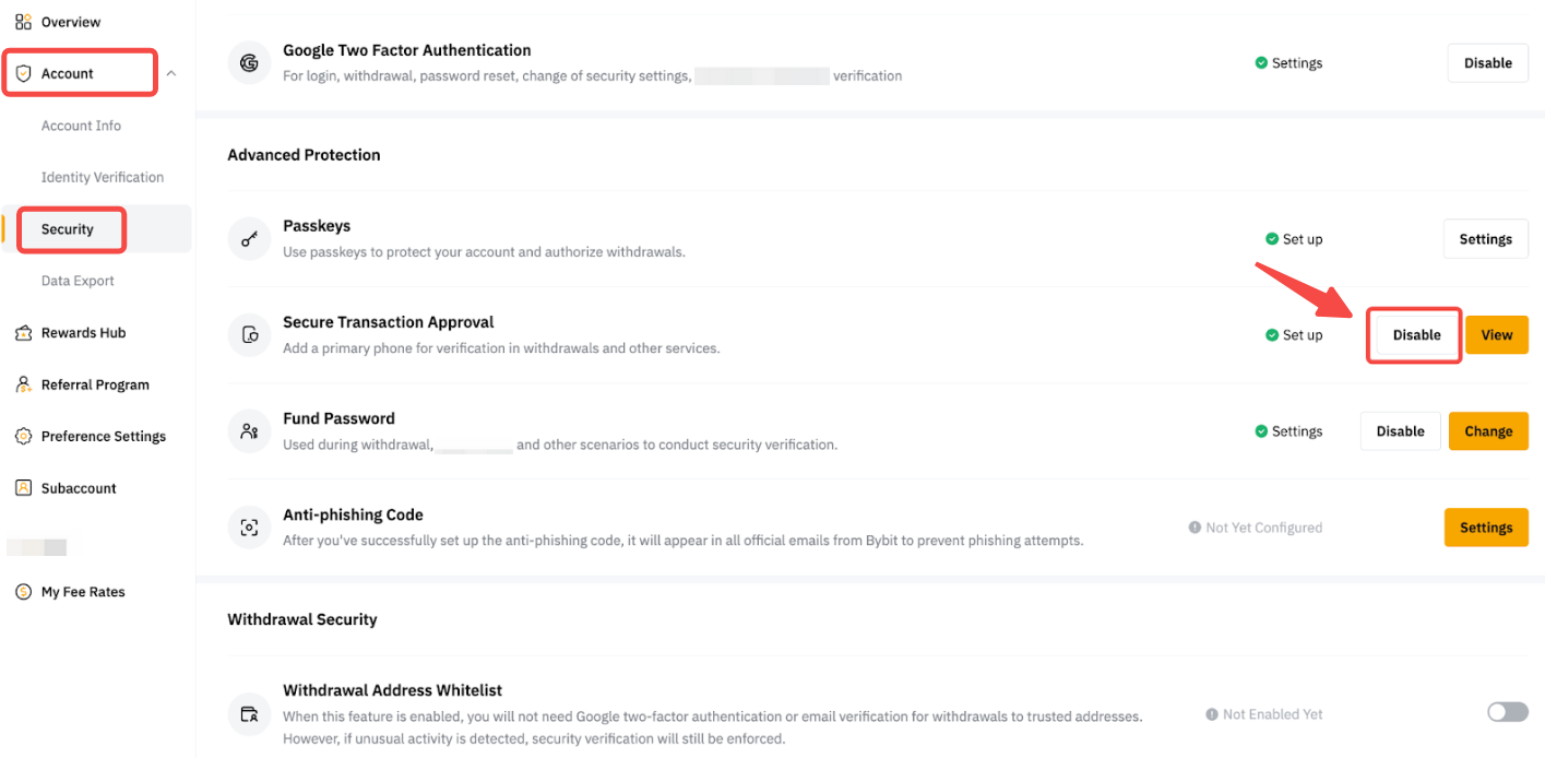 Step 1: Click your profile picture in the top-right corner, then go to Account → Security → Advanced Protection. Under Advanced Protection, click Disable next to Secure Transaction Approval.