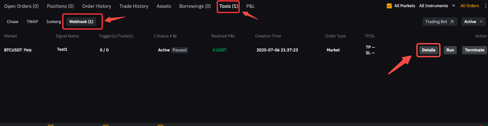 To view the specific details of the Webhook Signal, please go to the Tools tab, and then select Webhook. Here, you can view the Signal Name, Triggered / Trade Time, Realized P&L, and Time Created.