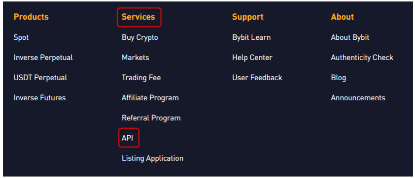 Step 1: Click on the link above to enter Bybit's Github API documentations. Alternatively, you can manually navigate to the 'API Documentation' page by following the 2 steps illustrated in the image below.