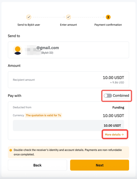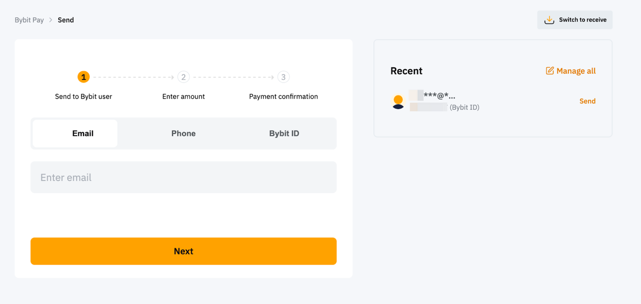 Bybit Pay Transferencia Interna le permite enviar fiat al instante y hacer que su destinatario reciba criptomonedas, o enviar criptomonedas y hacer que su destinatario reciba activos fiat o criptomonedas, todo ello sin cargos por transacción. Actualmente, enviar fiat a través de esta función sólo está disponible en la aplicación Bybit. Pronto se lanzará el soporte web.