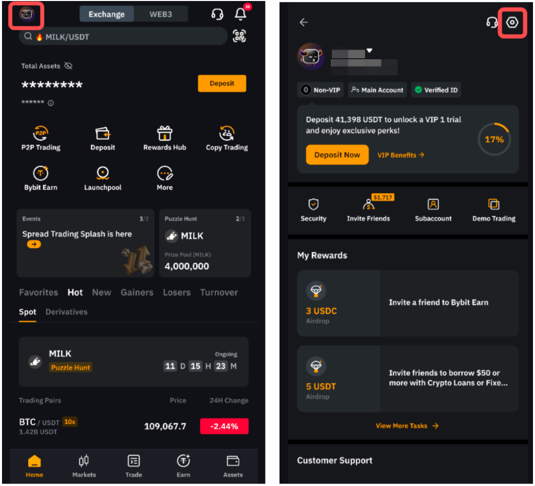 Paso 1: Inicia sesión en tu aplicación Bybit y toca el icono de perfil en la esquina superior izquierda para acceder al icono Configuración en la esquina superior derecha.