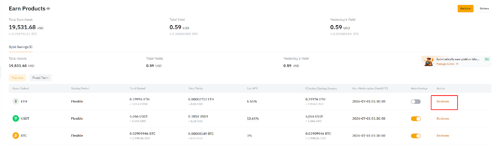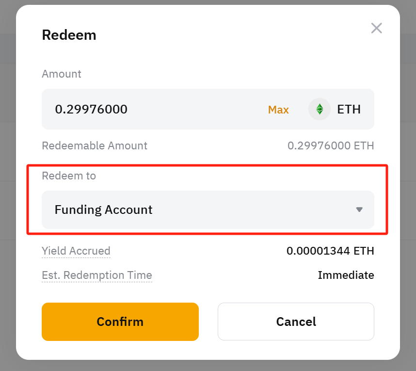 Puedes optar por canjear tu capital a tu cuenta de financiación o a tu cuenta de trading unificada. Sin embargo, tu rendimiento siempre se abonará en tu cuenta de financiación.