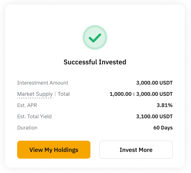 ¡Has invertido con éxito en el plan Easy Earn que elegiste! Puedes hacer clic en Ver mis holdings para ver tu orden o hacer clic en Invierte más para hacer otra orden en el mismo plan.
