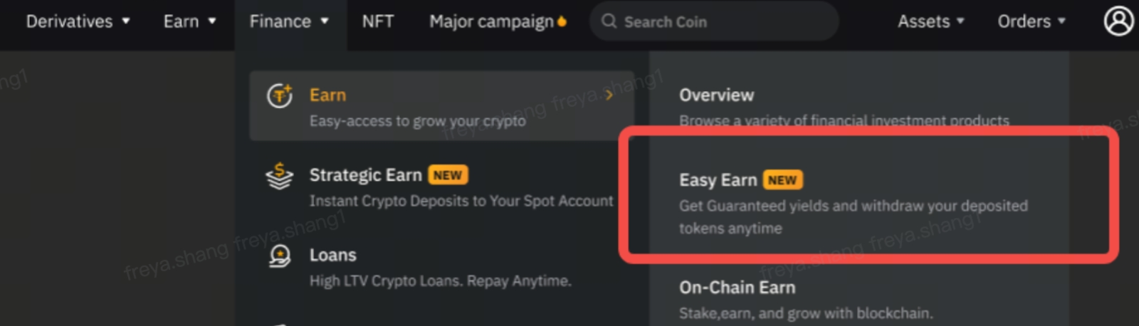 Paso 1: Inicia sesión en tu cuenta de Bybit y haz clic en Finanzas → Earn → Easy Earn en la barra de navegación.