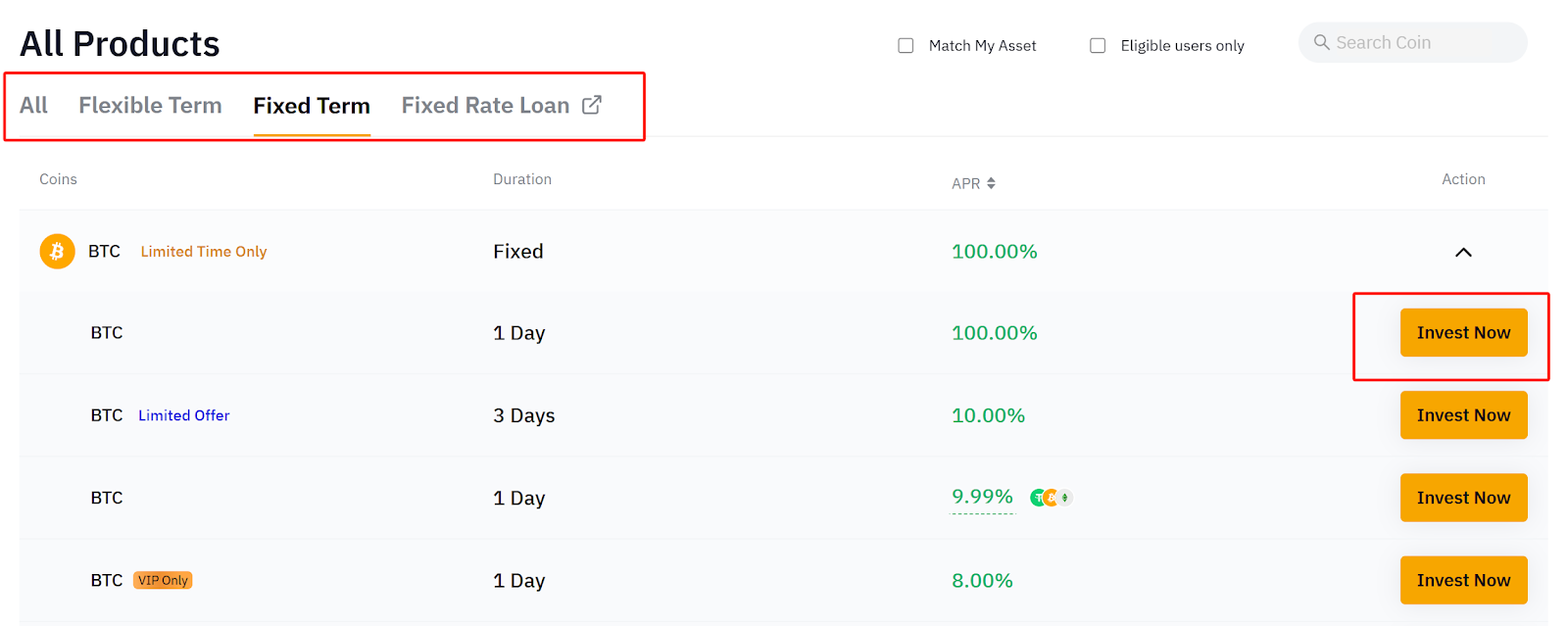 Paso 2: Elige tu plan de Easy Earn preferido según la moneda, la duración y la APR, luego haz clic en Invertir ahora.
