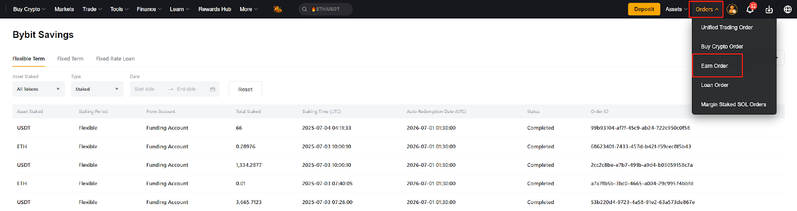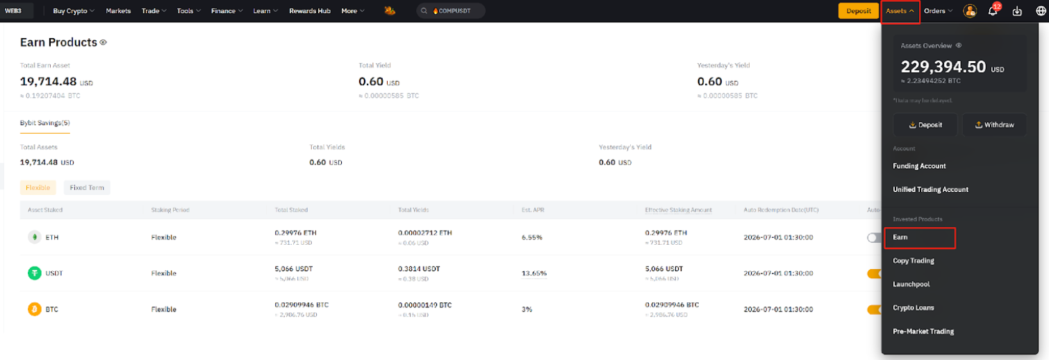 Opción 1: Coloca el cursor sobre Activos en la barra de navegación y haz clic en Earn. Desde allí, puedes cambiar entre los productos de Plazo flexible y Plazo fijo para ver información como la cantidad invertida, el rendimiento total y la fecha de canje.