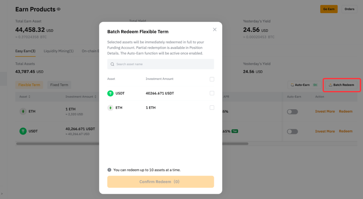 Paso 1: Ve a Activos → Earn para acceder a la página Productos de Earn. Selecciona el plan de plazo flexible que deseas canjear, revisa los detalles de la orden y haz clic en Canjear.