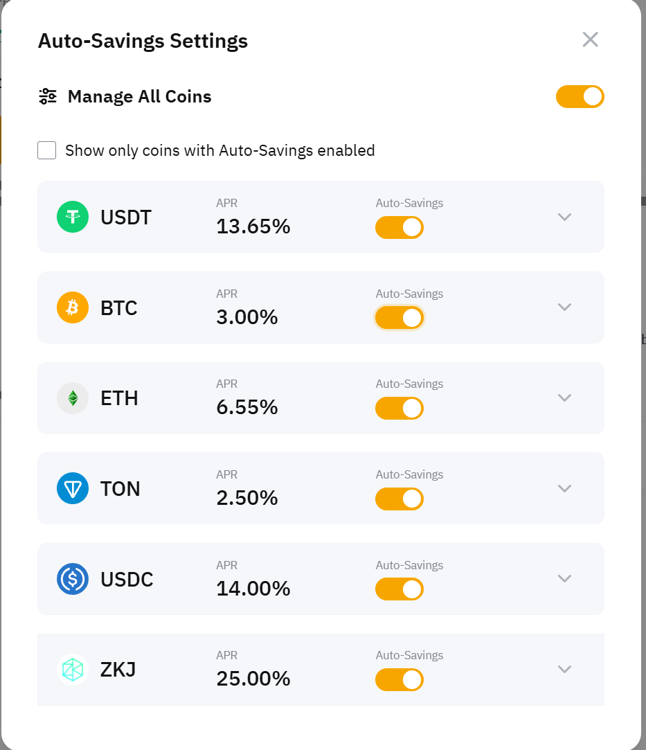 Paso 3: Haz clic en Confirmar. Aparecerá la página de configuración de Auto-EarnGestionar todas las monedas está activado por defecto. Desde aquí, puedes activar o desactivar Auto-Earn para cada moneda compatible.