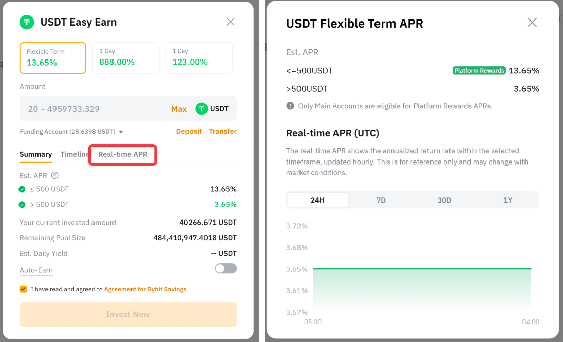 Para productos de plazo flexible, verás un ícono de APR en tiempo real. Haz clic en él para cambiar entre 24H7D30D y 1A y ver el rendimiento en distintos períodos de tiempo. Un subrayado punteado indica que la APR es escalonada y varía según el monto de tu inversión.