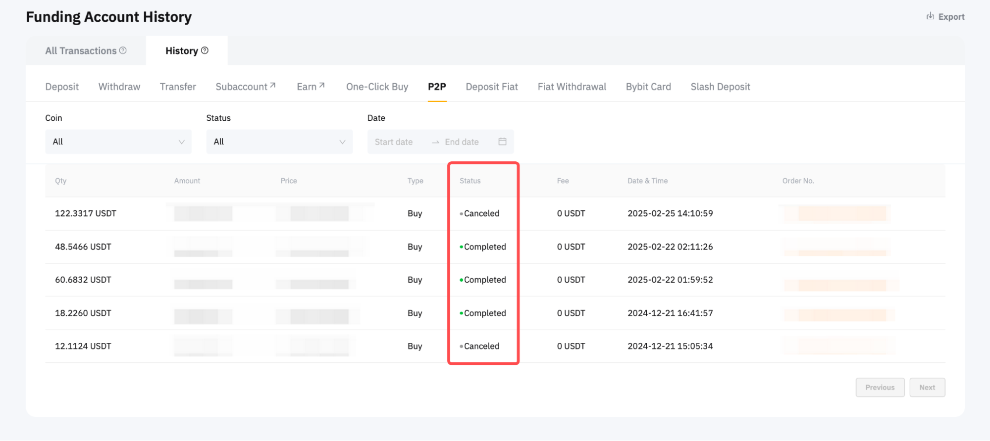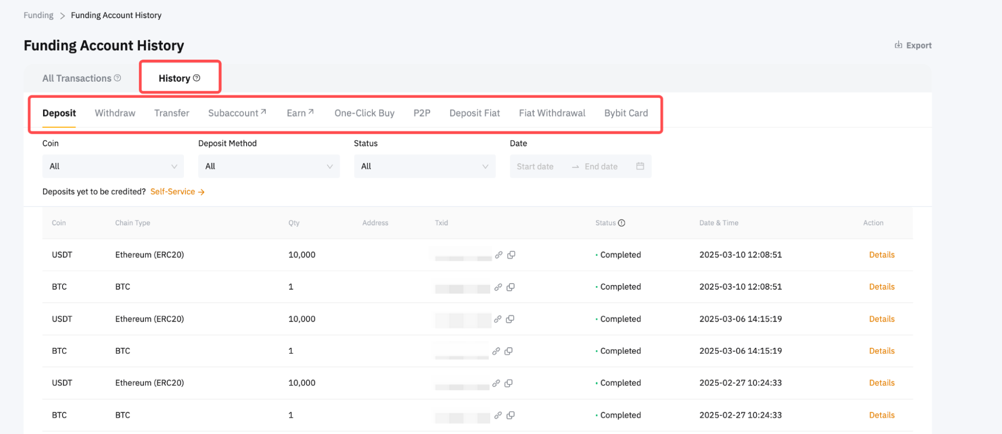 The History tab allows you to view all your asset transaction history primarily based on the types and methods with which you receive or send your managed assets. These categories encompass crypto/fiat deposits and withdrawals, transfers, One-Click-Buy, P2P trading, Subaccount, Earn, and Bybit Card transactions.