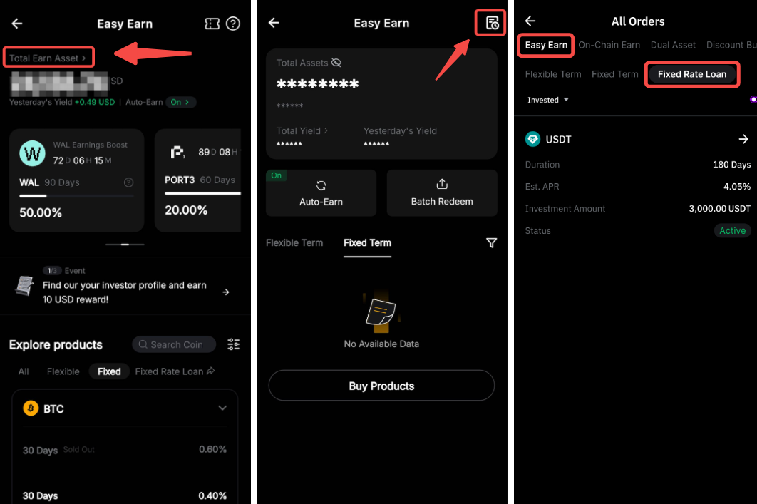 Jika Anda mengakses melalui aplikasi, buka Earn → Easy Earn → Total Earn Asset → Ikon Riwayat → Easy Earn: Pinjaman dengan Suku Bunga Tetap.