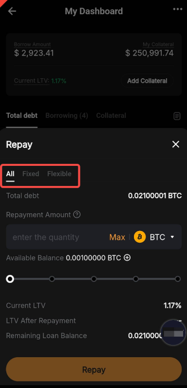 Ya, pembayaran kembali menggunakan jaminan saat ini didukung. Anda dapat memilih lebih dari satu jenis jaminan untuk pelunasan Pinjaman dengan Suku Bunga Fleksibel dan Pinjaman dengan Suku Bunga Tetap. Tingkat konversi akan dihitung berdasarkan Harga Indeks dari aset jaminan dan aset utang.
