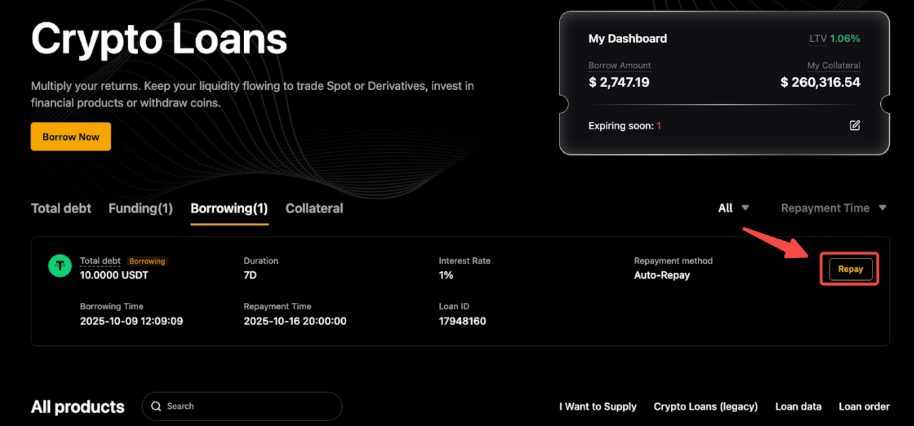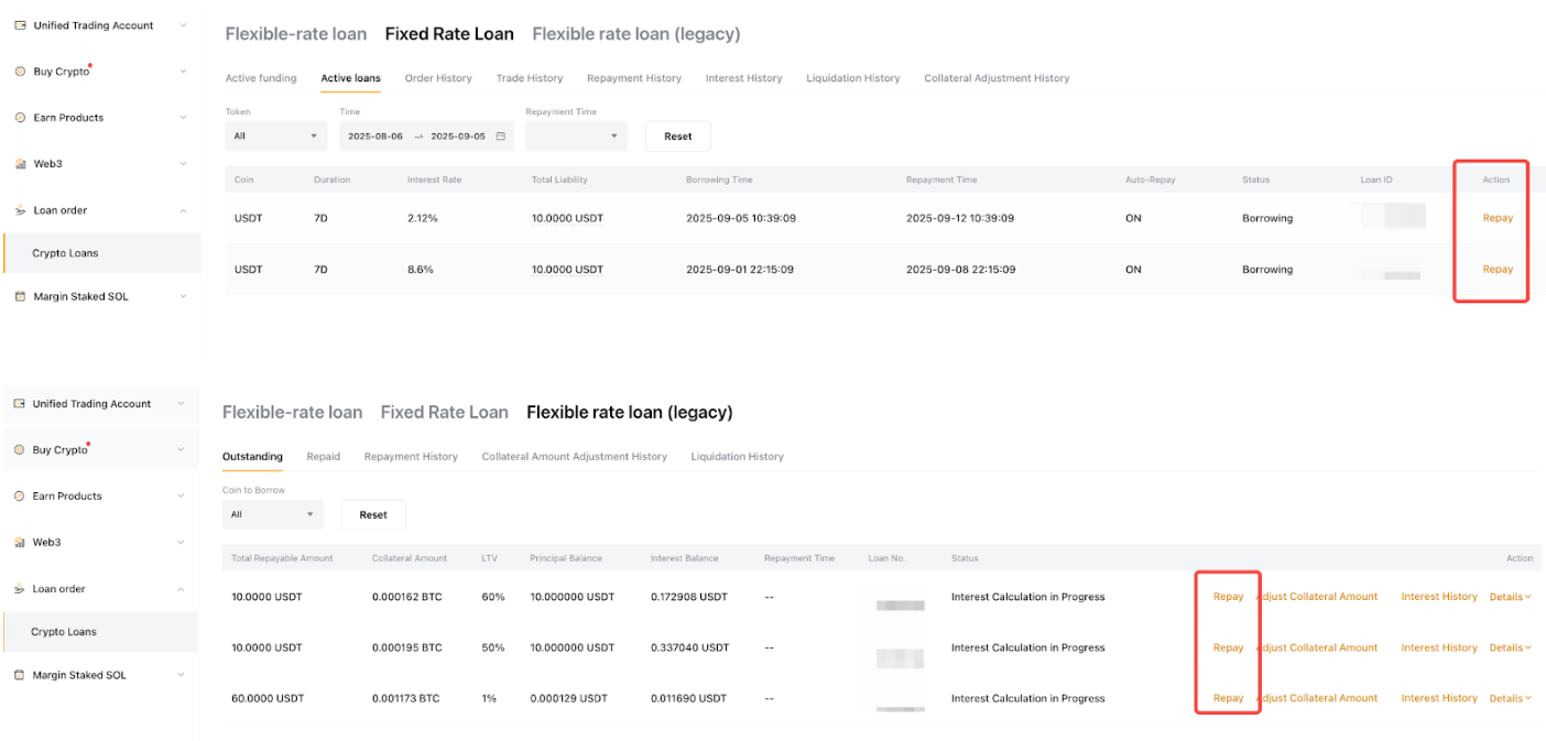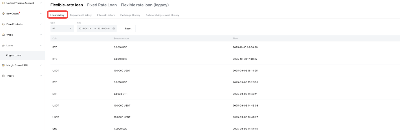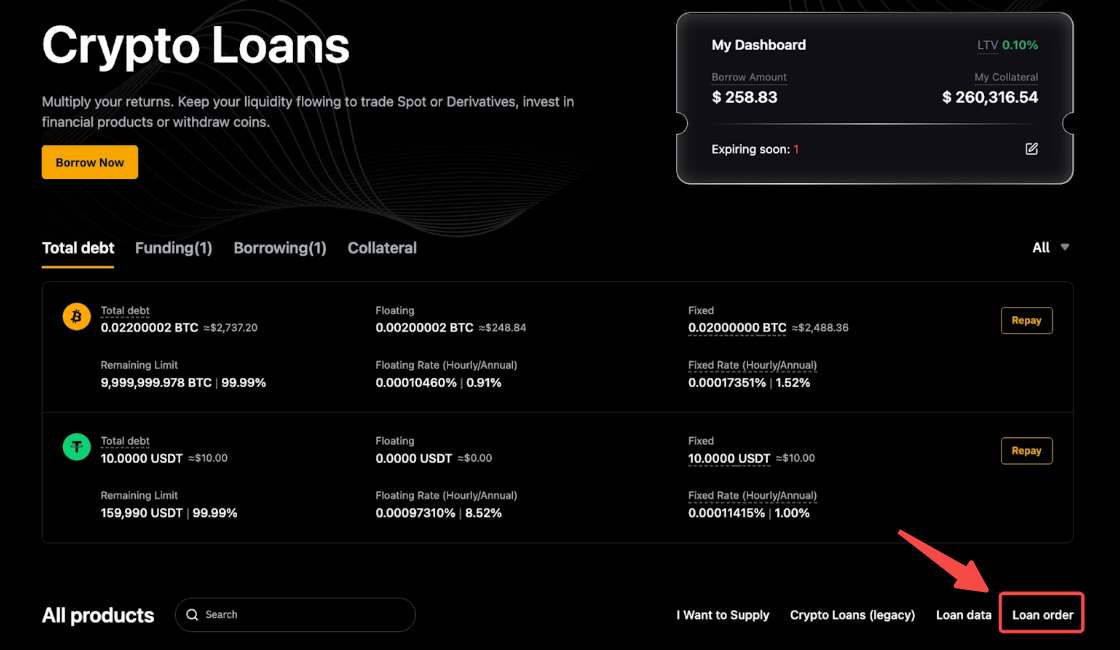 すべての注文の完全なリストを表示するには、概要ダッシュボードローン注文をクリックします。 暗号資産ローンのすべての注文は、貸し出し、返済、利息、担保などの詳細情報を含む、借入(固定)、フレキシブルレートローンなどの商品タブを上に切り替えて確認できます。また、資産や時間でフィルタリングして結果を絞り込むこともできます。