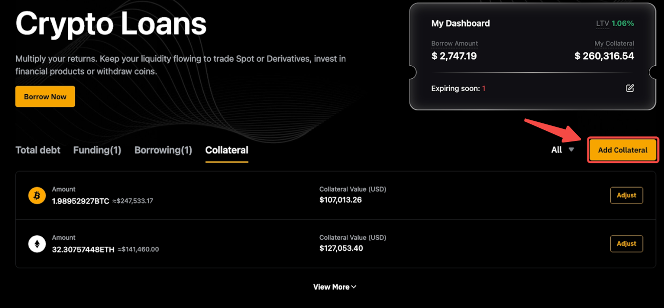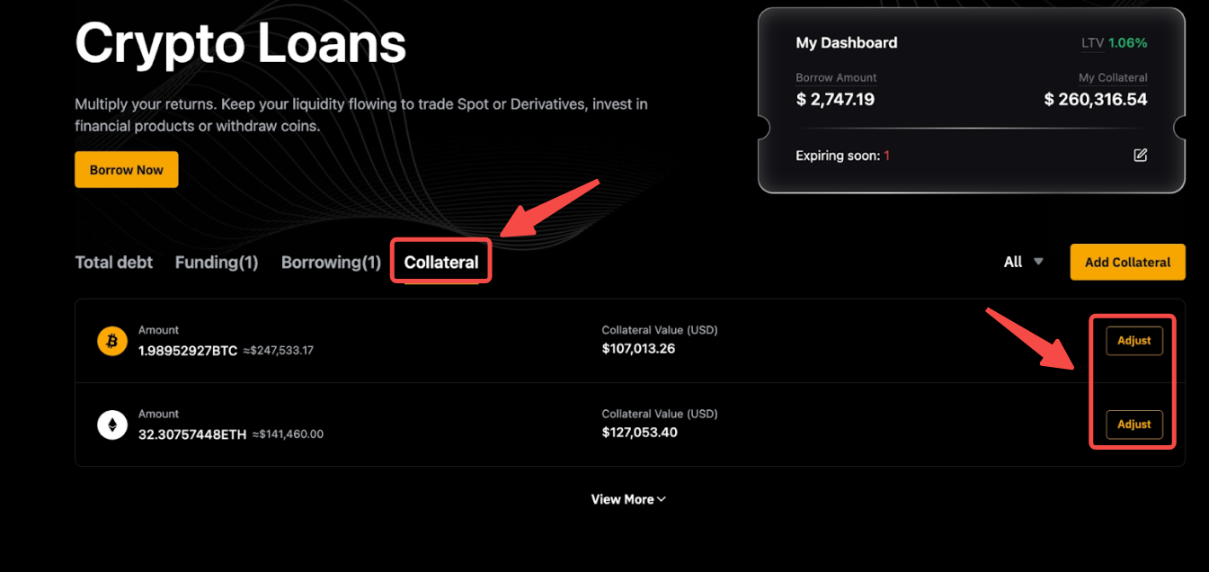 4. 担保 — すべての担保資産を、その数量とUSD価値で一覧表示します。 調整をクリックして担保を変更します。
