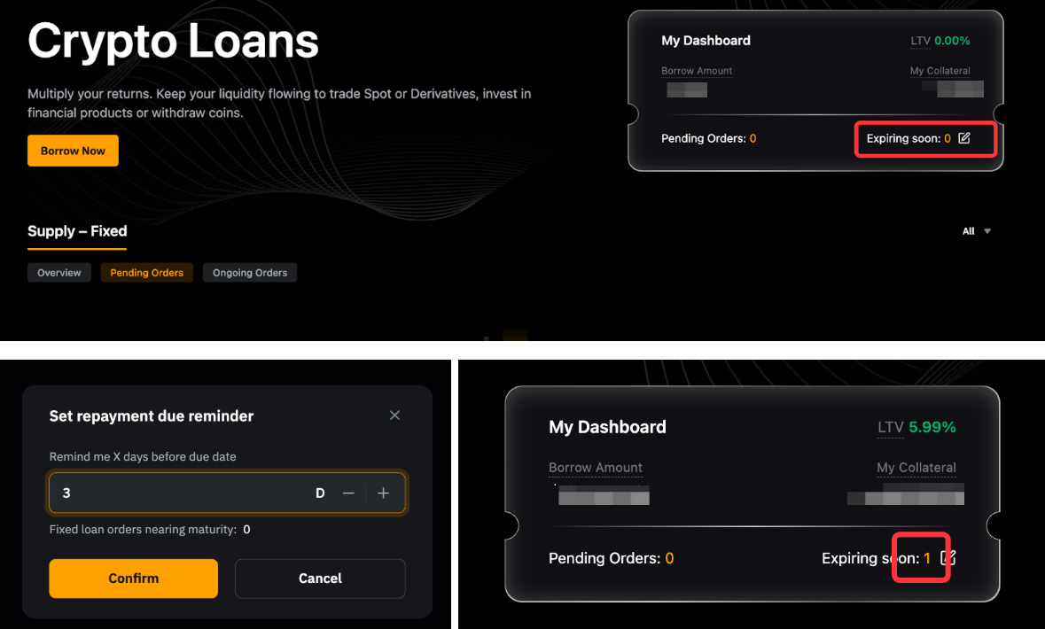 ・「返済期日」のリマインダーを有効にするには、暗号資産ローンのホームページに移動し、「マイダッシュボード」「満期日」の横にある「編集」アイコンをクリックし、期日前の日数を設定します。 返済期限が迫ると、期限切れの商品数がまもなく期限切れの横に表示されます。
