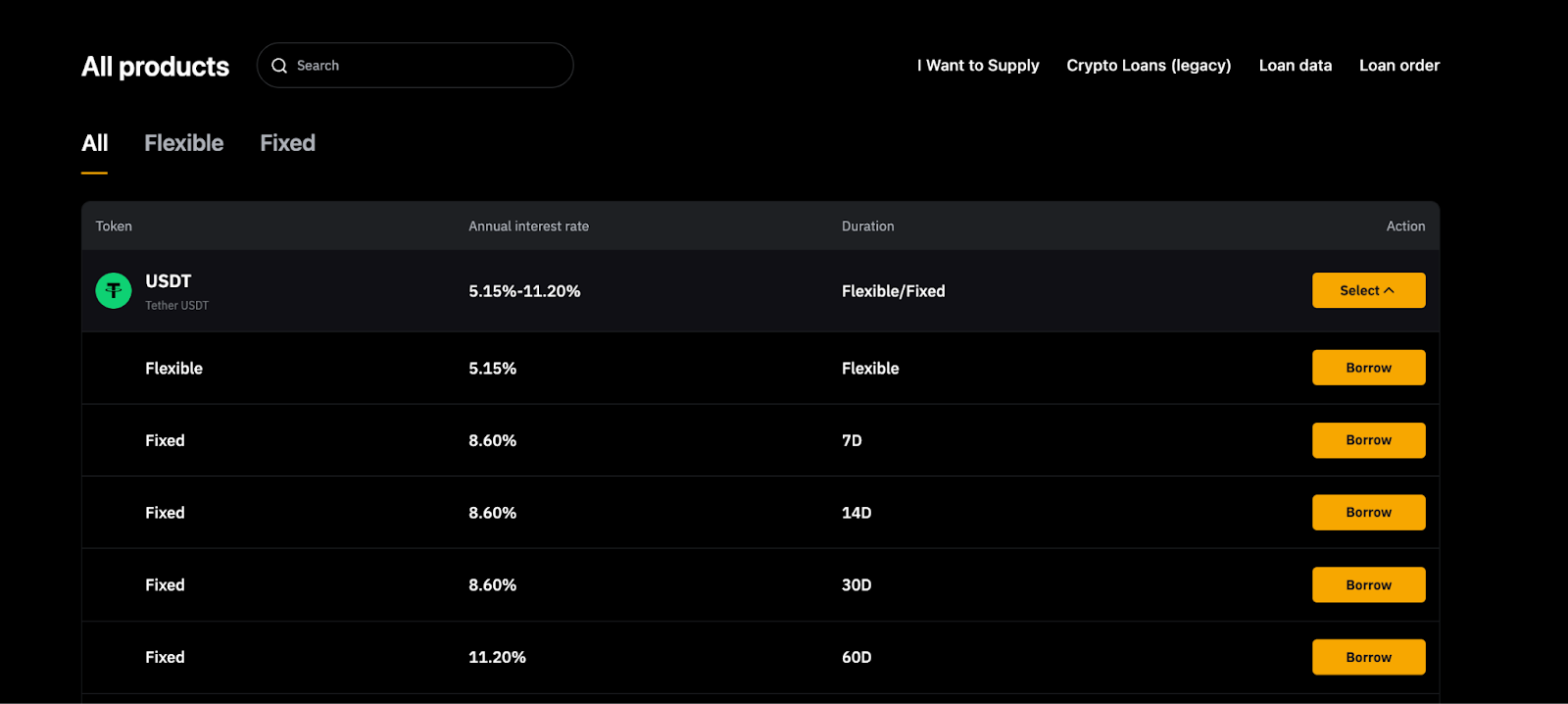 ステップ2:「すべての商品」では、変動金利ローンと固定金利ローンのオプションが表示されます。借入を希望する資産を選択または検索して、利用可能な期間と対応する金利を確認します。希望するオプションの「借入」をクリックします。