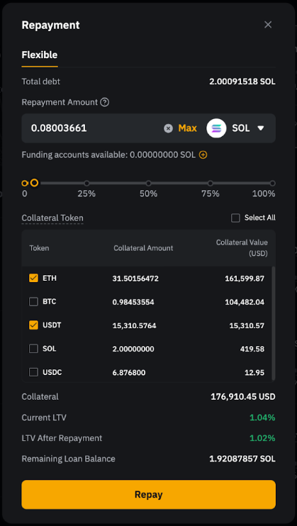 さらに、返済のために複数の種類の担保を選択することもできます。確認ポップアップで返済詳細を確認し、返済をタップしてください。担保の暗号資産を使用して暗号資産ローンを返済する場合、手数料が適用されます。手数料レートは、担保資産と借入資産の返済手数料レートのうち、高い方になります。交換レートは、担保資産と借入資産の両方のインデックス価格に基づいて計算されます。