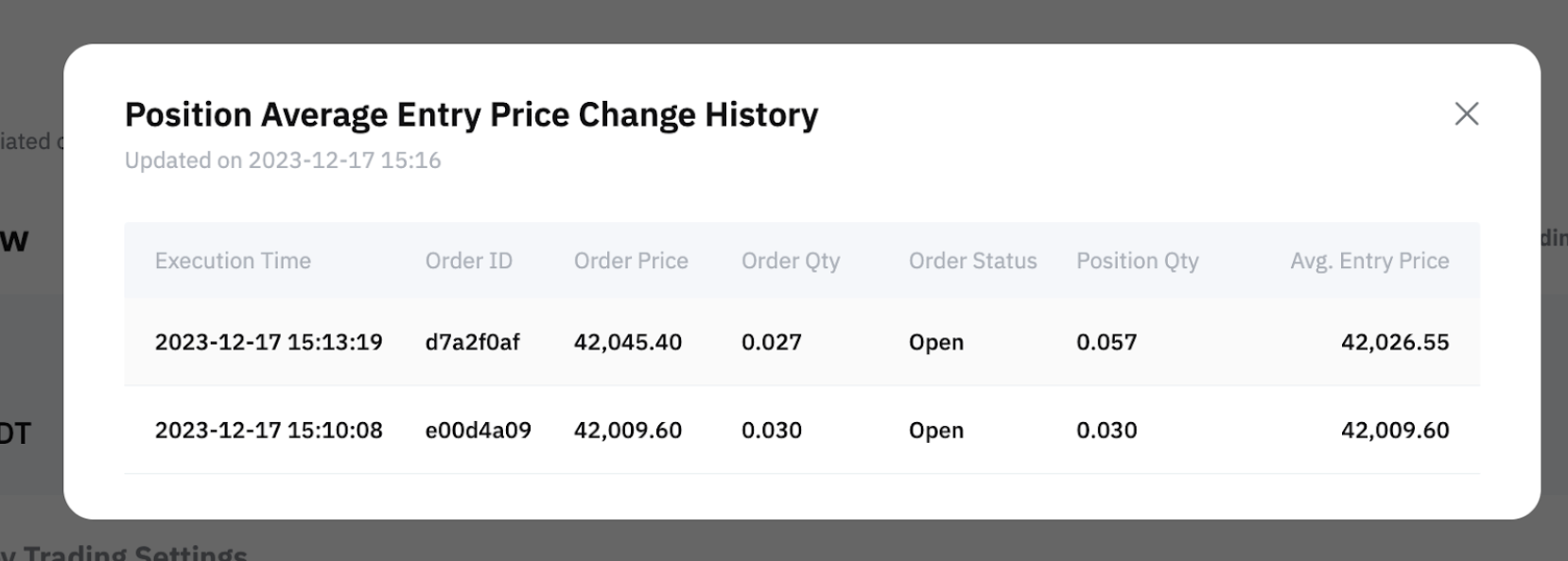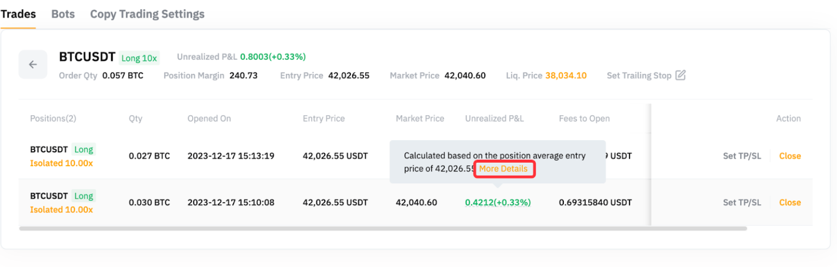 ポジションの詳細に表示される参入価格は、ポジション平均参入価格であることにご留意ください。ポジションの参入価格がどのように導出されるかを確認するには、カーソルを未実現損益に移動し、「詳細」をクリックすると、ポジション平均参入価格の変更履歴を確認することができます。