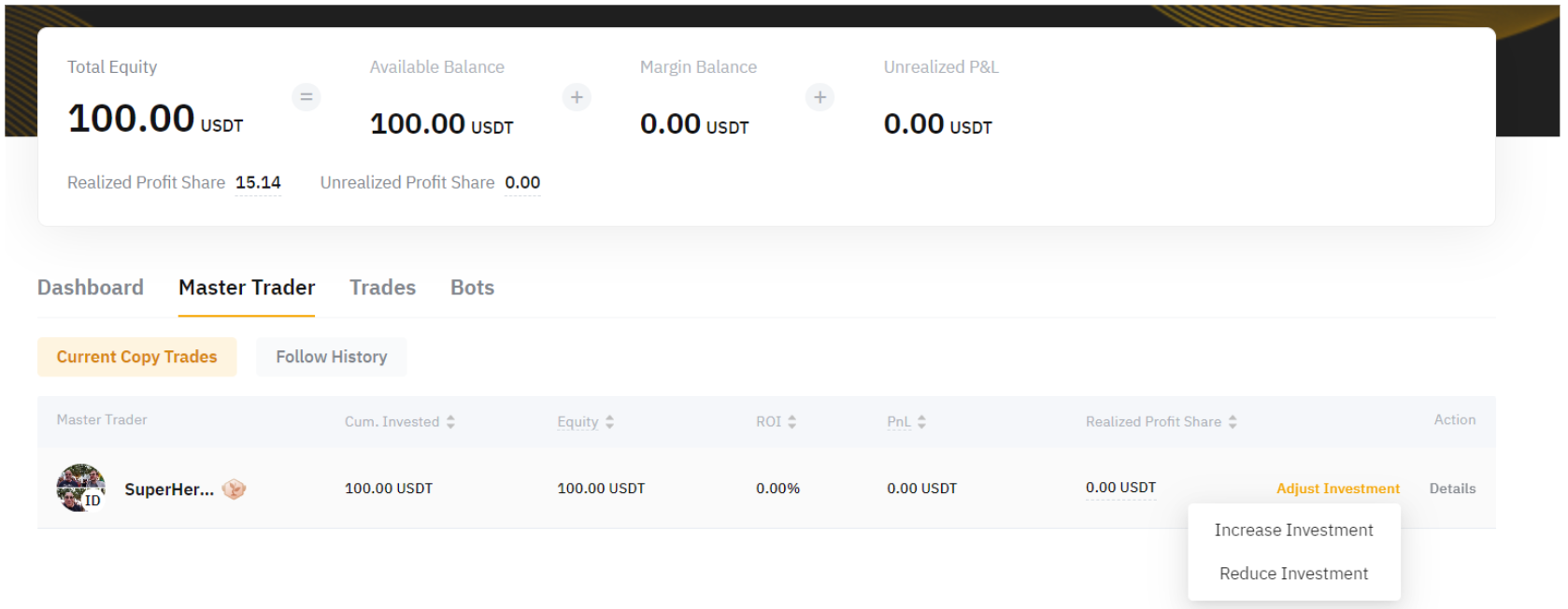 各マスタートレーダーの「現在のコピートレード」と「フォロー履歴」を見ることができます。また、投資額の調整をクリックすると、それぞれのマスタートレーダーをコピーするための資金を増減することができます。減額された金額は、お客様の資金調達アカウントに自動的に送金されます。