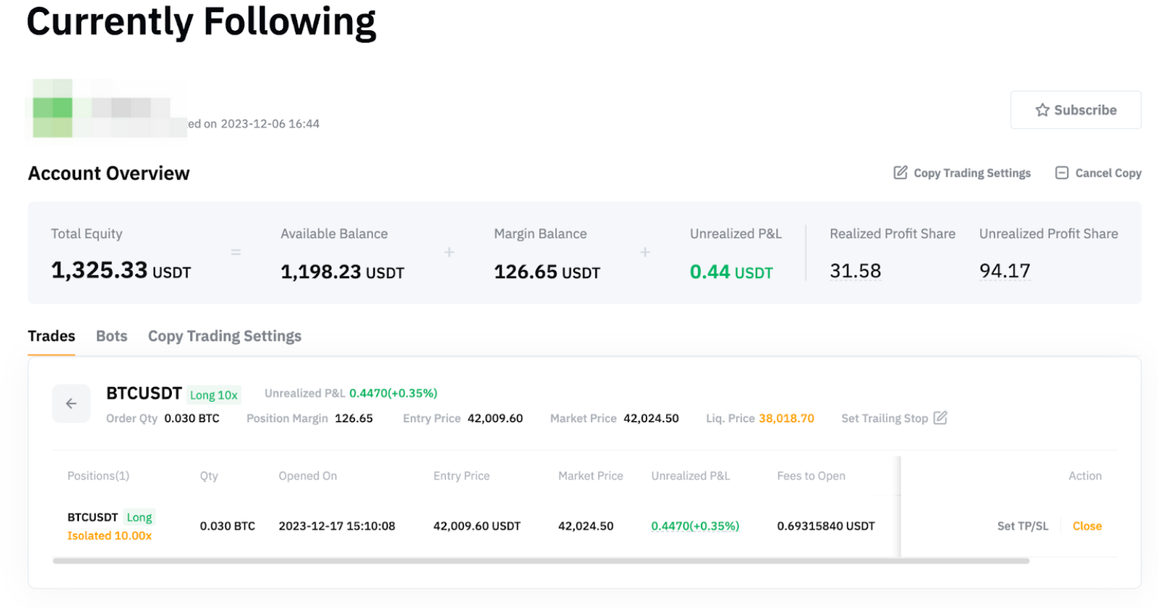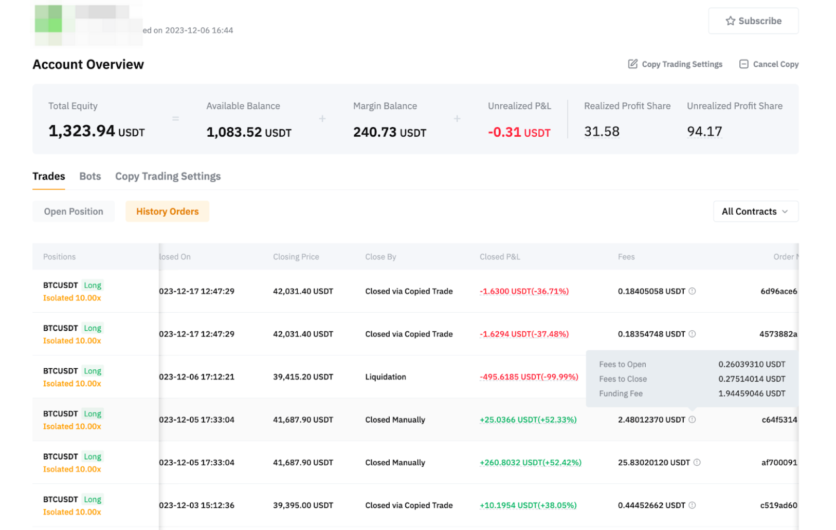 「詳細」をクリックして「現在のフォロー」のページに移動すると、コピーしたポジションの詳細が表示されます。