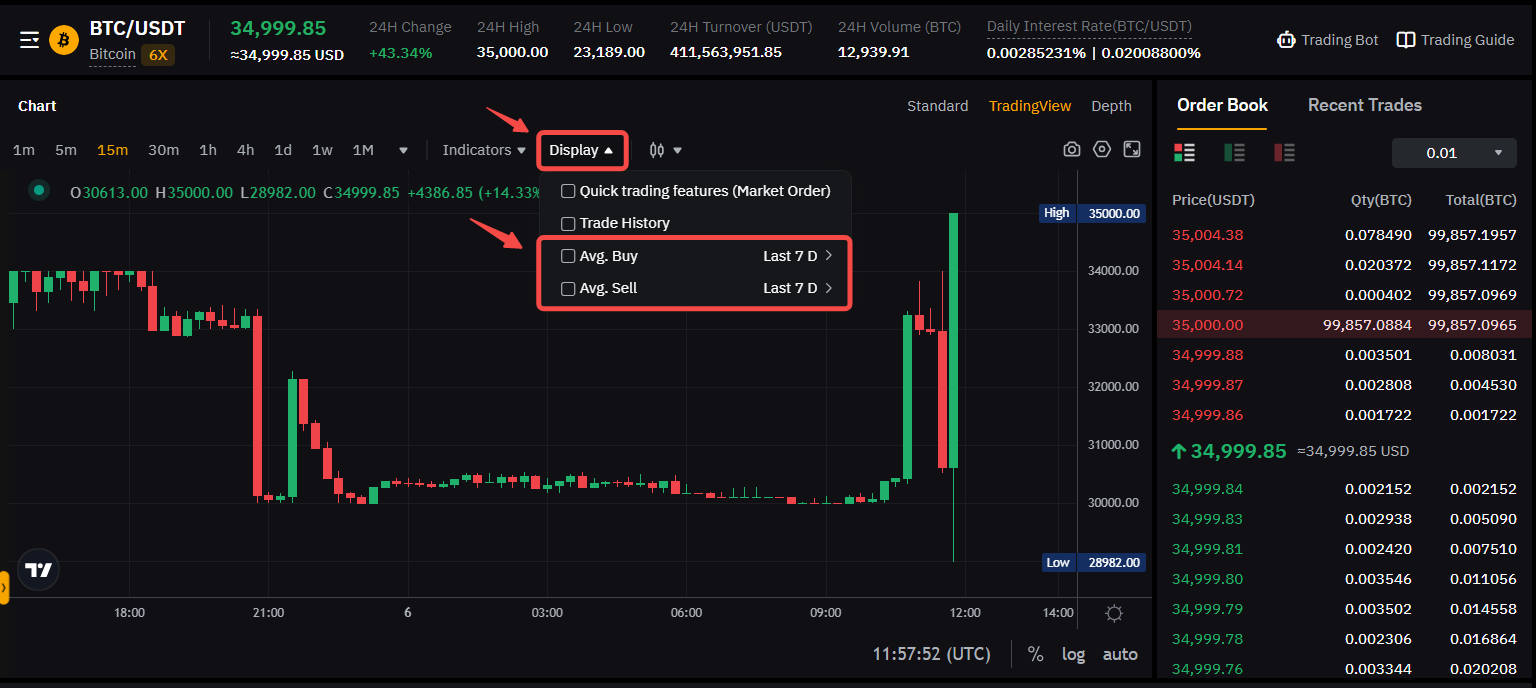 When trading on Spot, you can display the average price of your Sell and Buy orders directly on the trading chart. To activate it, click on Display and tick the average price you would like to see. You can also select the period on which the average will be calculated (last 7, 30, 60 or 90 days). Please note that the average price will be calculated from the current day to the last day of the selected period.