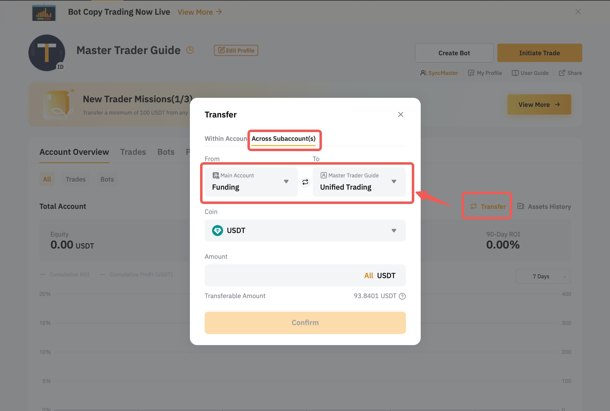 Transfer to Master Trader Account: Transfer a minimum of 100 USDT from any account within your Main Account to this Master Trader Account