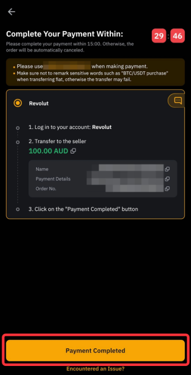 Make payment in fiat according to the payment method you have selected. Ensure you are transferring the right amount to the right account via the right methods. After you have done so, click the Payment Completed button to notify the seller.