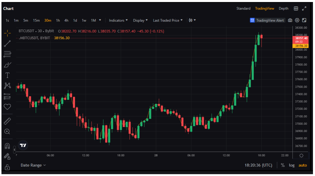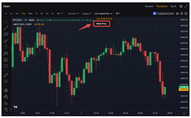 You can check the current Mark Price from the flagged orange price in the order book or consult the Mark Price evolution in the trading chart by clicking on Last Traded Price and selecting Mark Price.