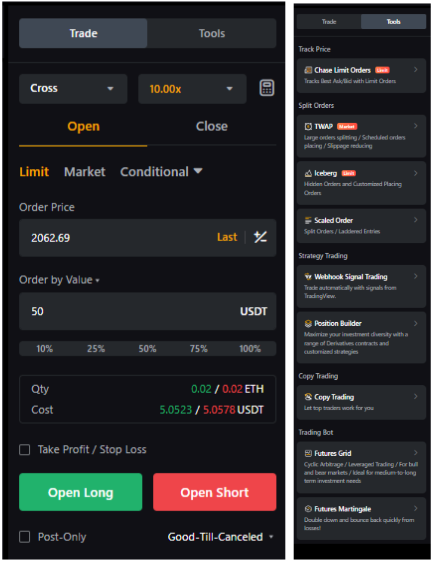 When Hedge mode is selected, you will see an open and close tab when the Hedge Mode is selected. You can use the Open tab to place open long and short orders. If the order is for closing purposes, traders can use the Close tab to close long or short positions.