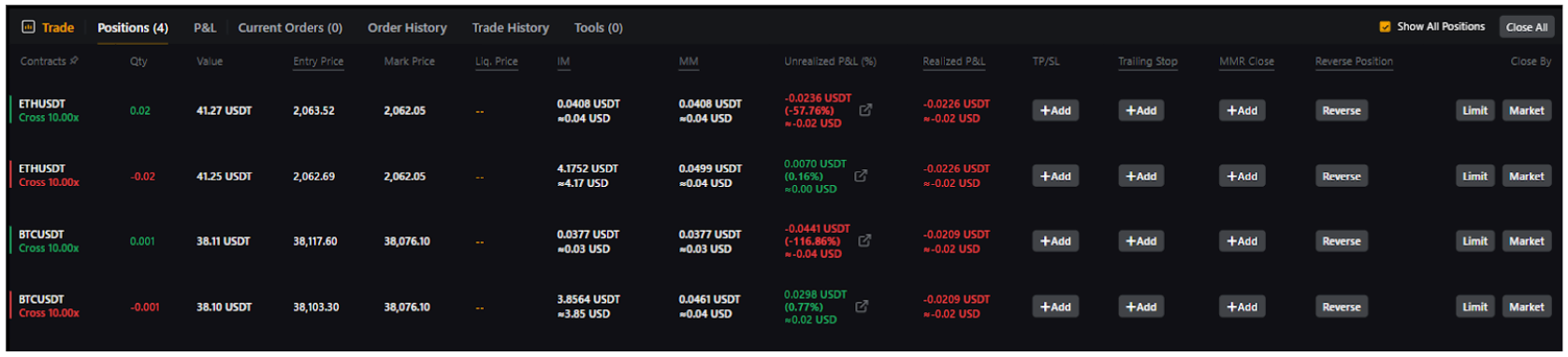The option Show All Positions or All Contracts allows you to view all positions held in all different trading pairs at once.
