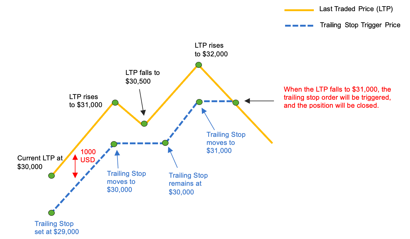 1. If the last traded price never exceeds $30,000, the Trailing Stop will be triggered at $29,000, similar to a normal stop loss.