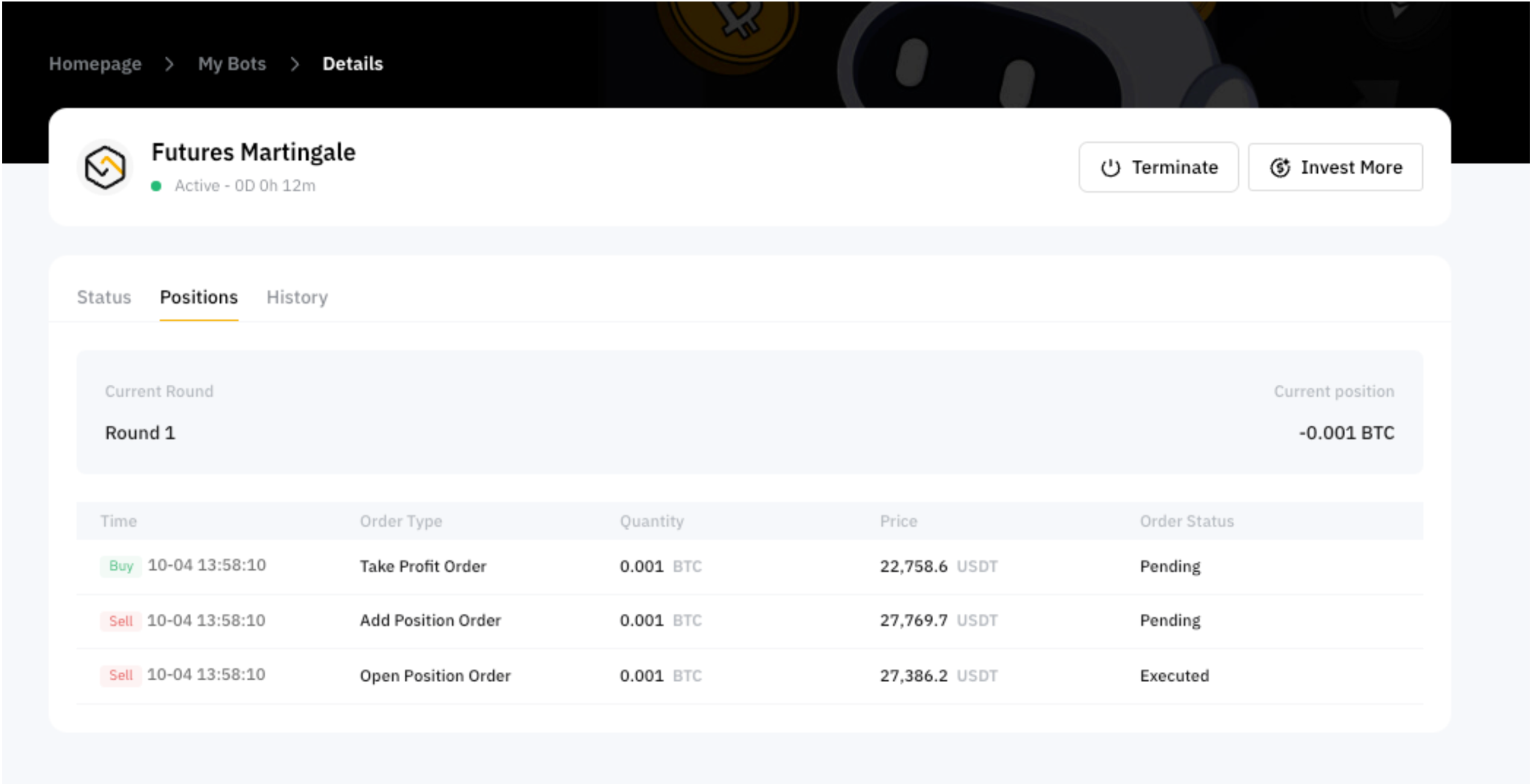 A página de histórico do robô mostra detalhes de P&L realizados para as rodadas anteriores. Clique em Detalhes e você verá o histórico de ordens e as taxas acumuladas para cada rodada.