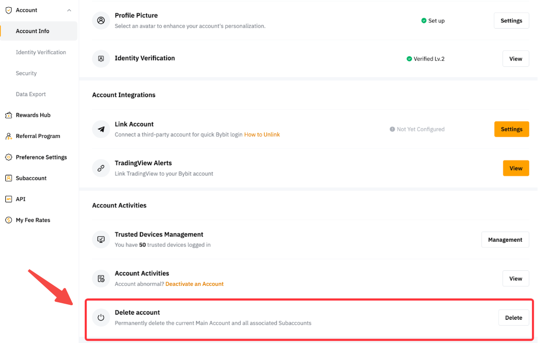 A Bybit lançou um recurso de exclusão de conta de autoatendimento, que permite aos usuários excluir suas contas por conta própria por meio da página Conta e segurança.