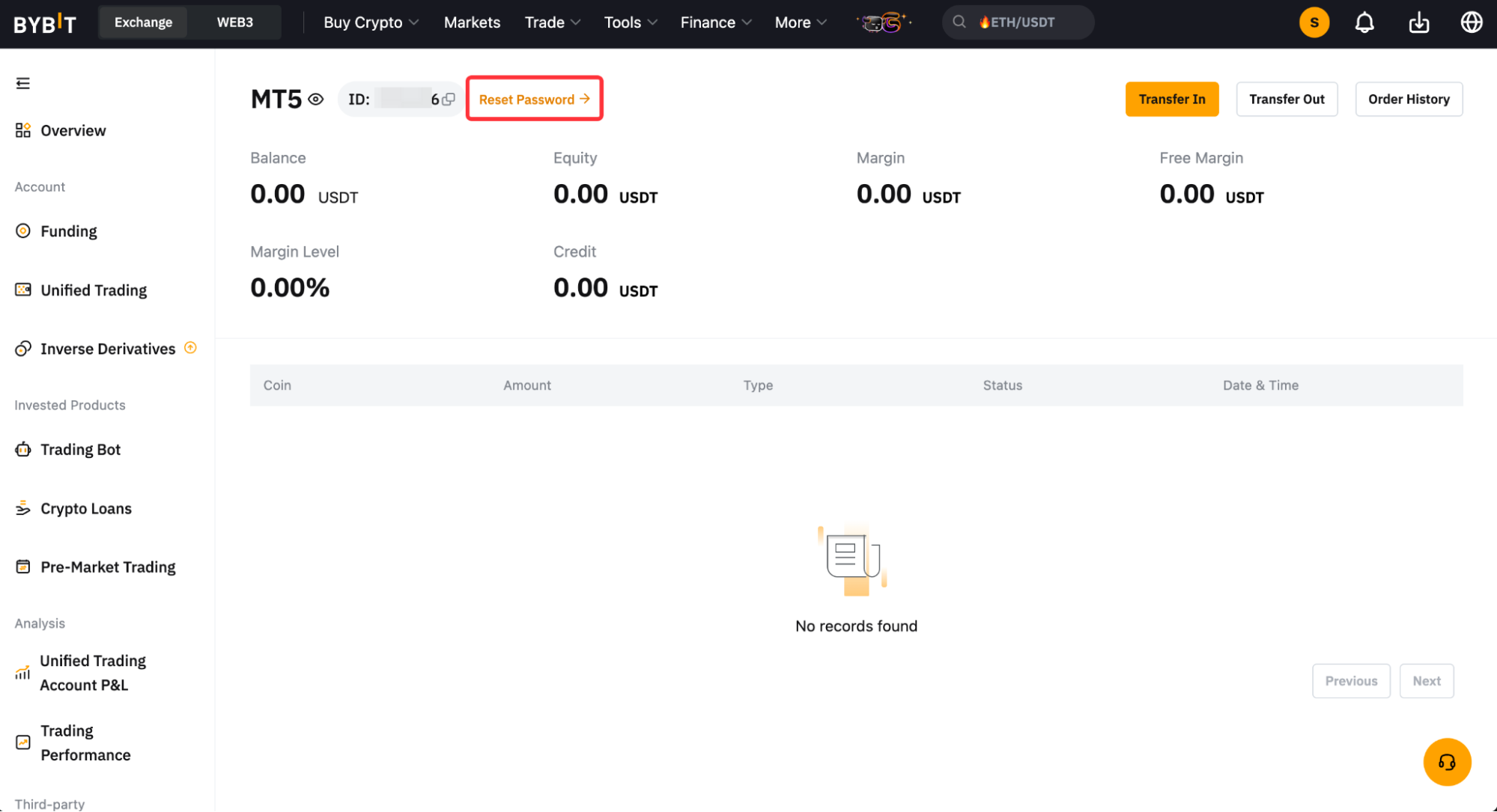 2º passo: Clique em Redefinir senha no canto superior esquerdo para definir a senha da sua Conta TradFi MT5. Configure a autenticação do Google na sua Subconta de TradFi Master Trader seguindo este guia, caso ainda não tenha feito isso.