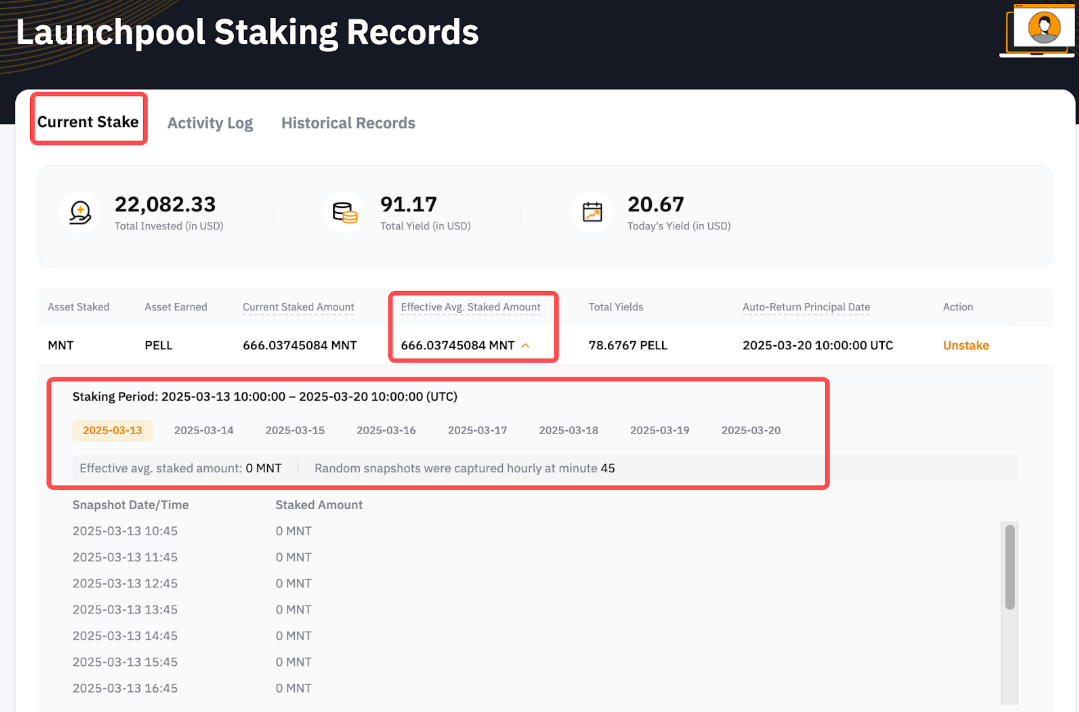 Os resultados do snapshot do Launchpool e os horários do snapshot aleatório diário serão exibidos na seção Valor médio efetivo em staking no registro de staking do Launchpool no dia seguinte após o snapshot diário terminar. Você pode selecionar uma data específica para visualizar a hora e os resultados do snapshot.