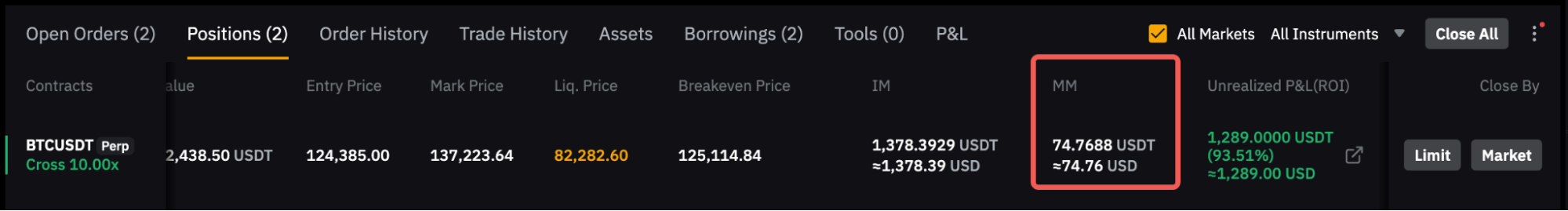 Nesse caso, a margem de manutenção total exibida na aba de posição será de 11.242 USDT (11.000 USDT + 242 USDT).