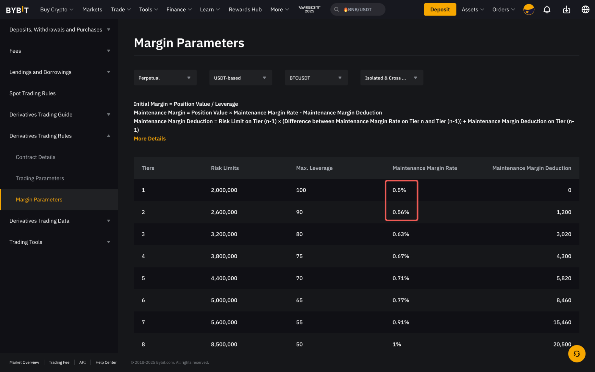 A MMR necessária para cada nível de limite de risco e o valor da dedução da Margem de manutenção podem ser facilmente encontrados na página de Parâmetros de margem.